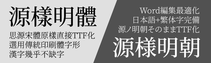 - 新增源起明體,與源樣明體大同小異,主要是修掉楷化的折筆為斷筆