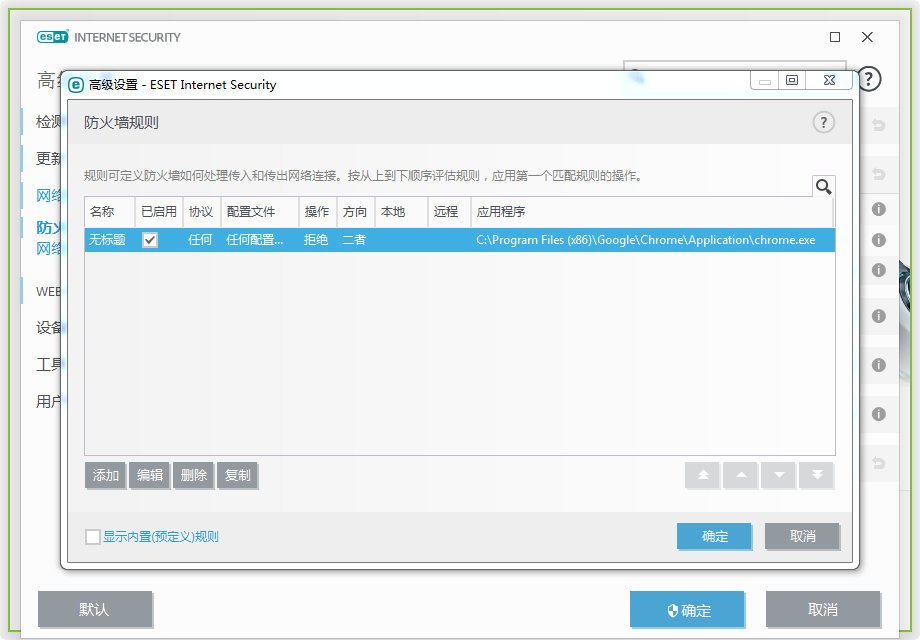 防火墙是自动模式,网络防护-防火墙-高级-规则里测试阻止chrome,可是chrome还是能上网,这到底是咋回事呀?设置如截图,从网上搜了半天也搜不到,是其他哪里还需要弄一下么?望大神们告知详情