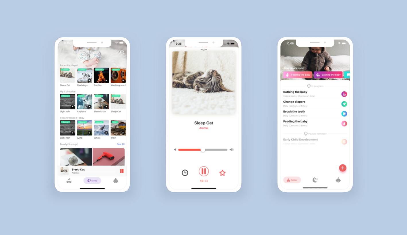 包含了来自家庭,自然,动物,都市的一些声音,另外还有摇篮曲和各种的白噪音,粉红噪音等等,家长们可以自定义关闭声音的时间。 -