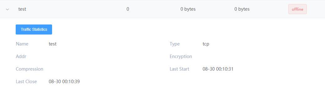 之后我随意添加了一个名为 “test” 的 tcp 转发,在 dashboard 里能看到。但当我在客户端的配置里把 “test” 删掉之后,dashboard 里还显示着一个空的 “test”——离线的没有端口号的。