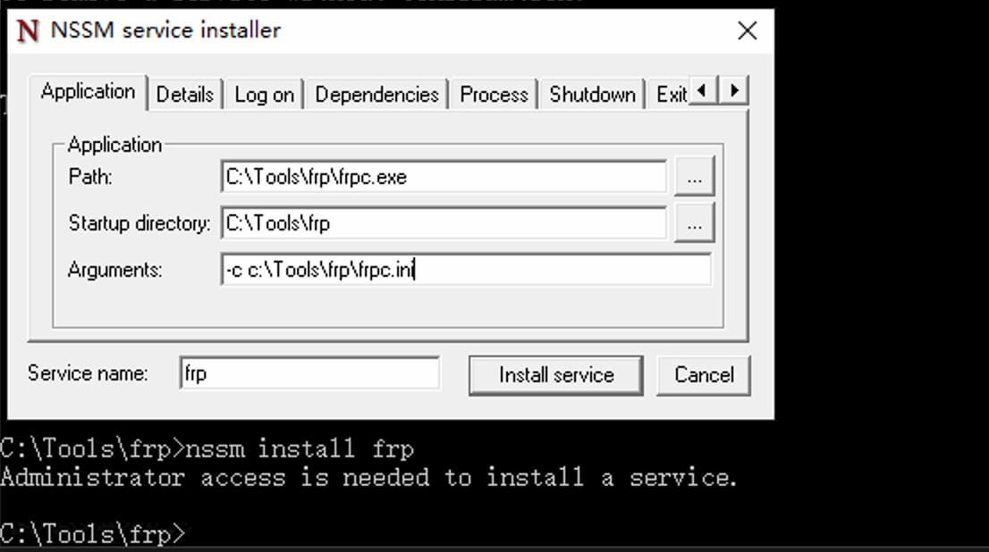 然后就会弹出窗口,如上图输入后,点击 Install Service 按钮,就会在服务中创建一个 frp 的系统服务了: