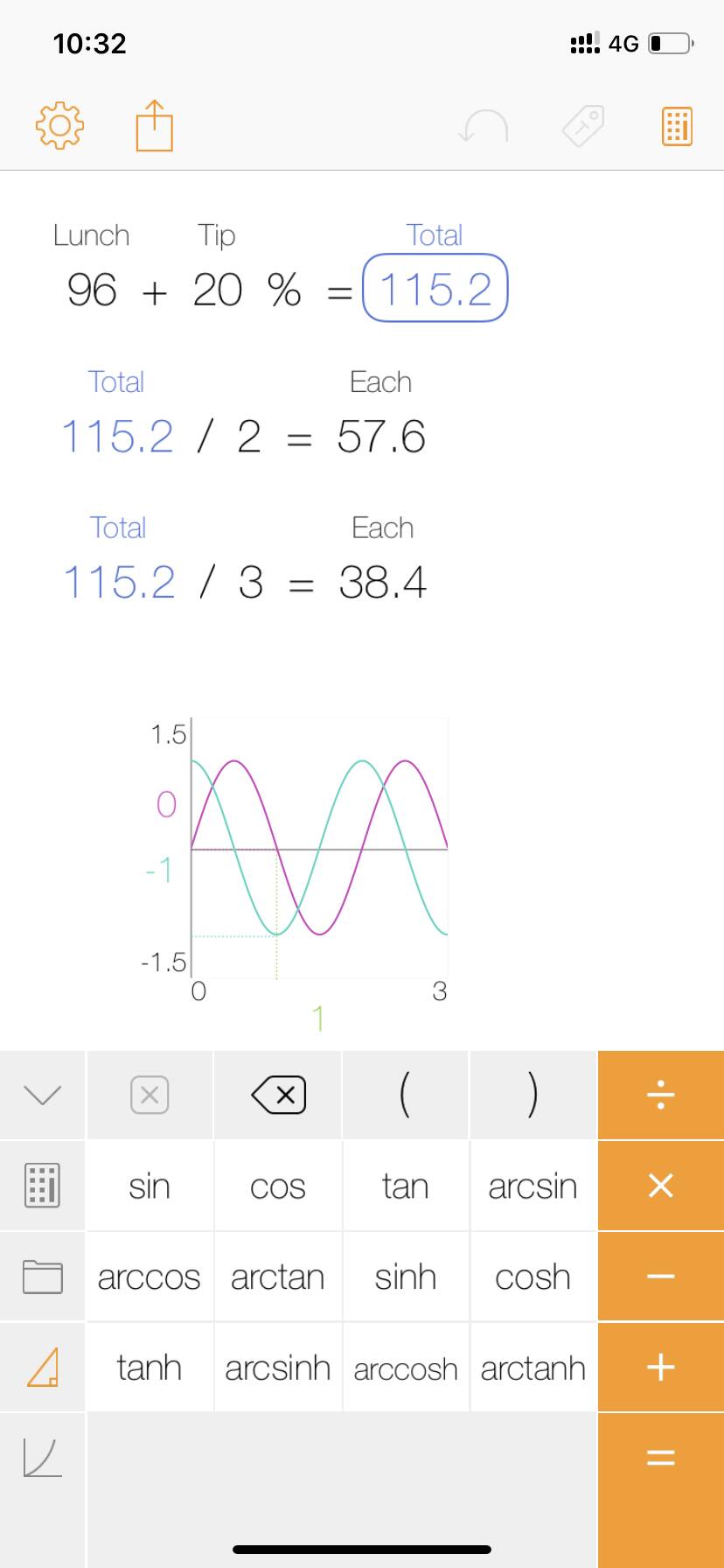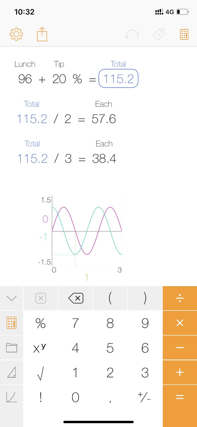 科学计算器模式依旧是所有按键一目了然,不用横屏也不用翻页,通过一个类似Shift键一样的2ndFunction键输入第二运算(不能直接用手势输入比较遗憾)。