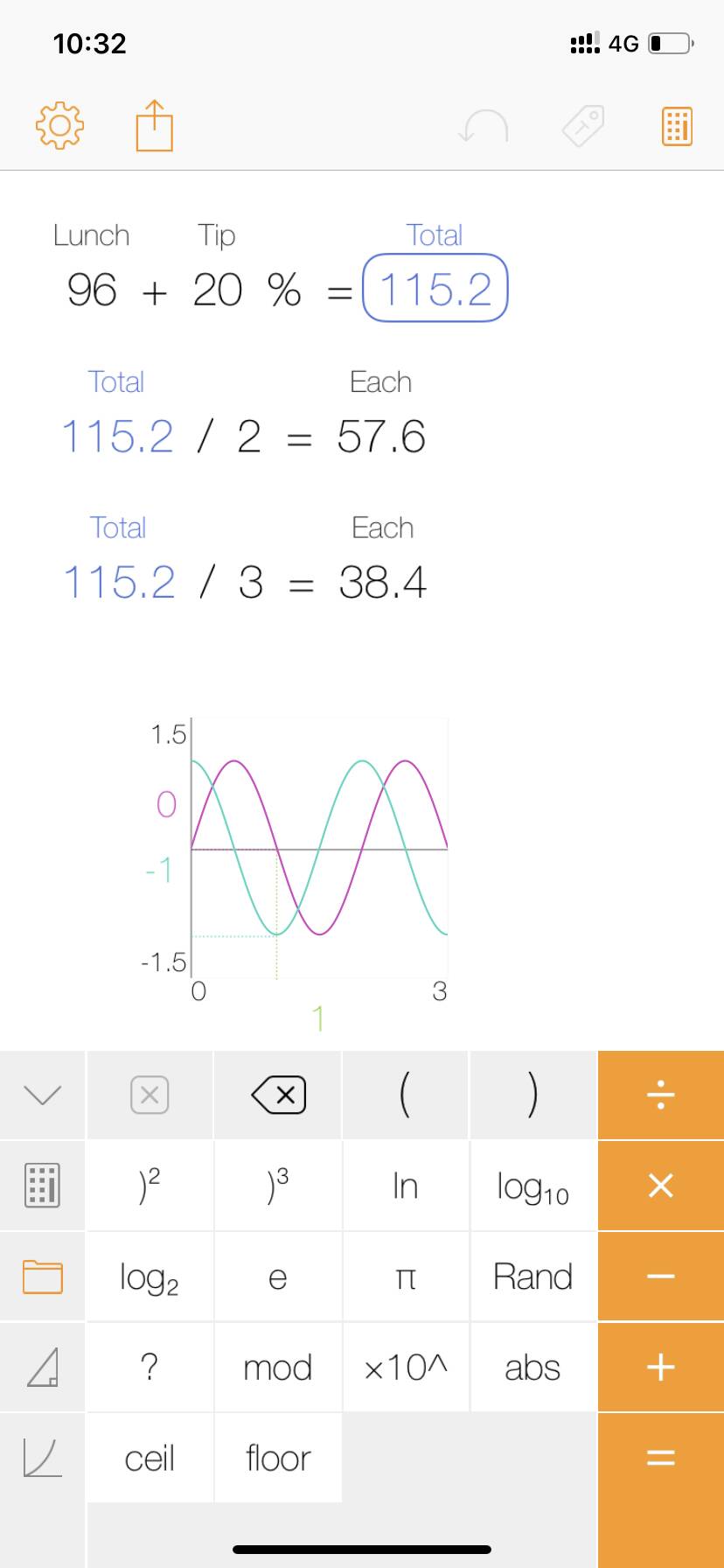 科学计算器模式依旧是所有按键一目了然,不用横屏也不用翻页,通过一个类似Shift键一样的2ndFunction键输入第二运算(不能直接用手势输入比较遗憾)。