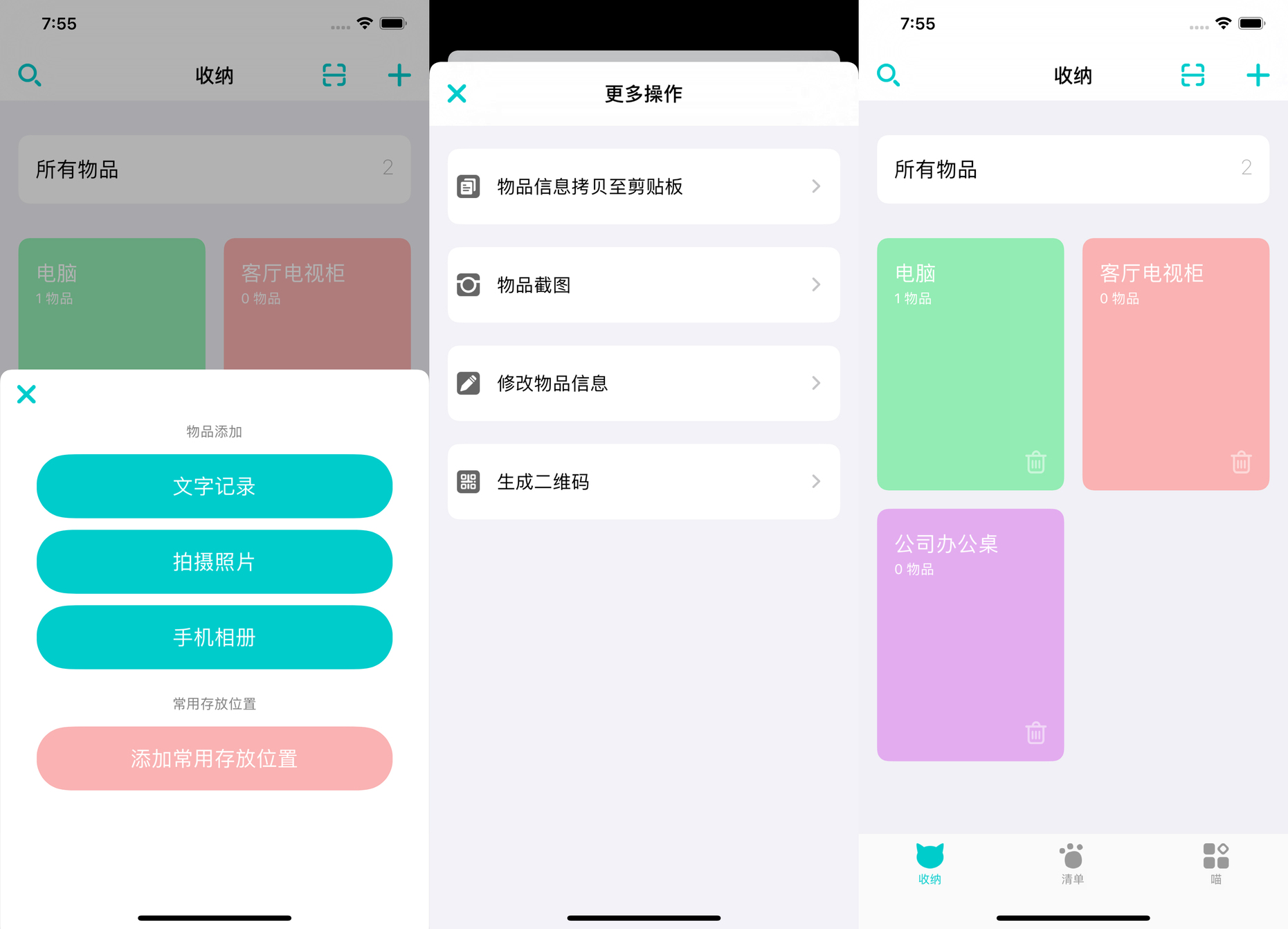 - 收纳物品生成二维码。把二维码贴在物品上,扫描二维码可查看物品信息,便于使用后放回原处。
