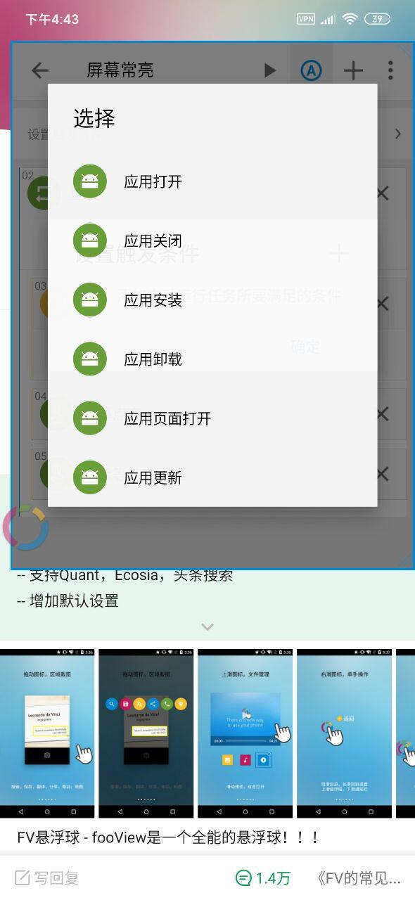 谢谢稻米鼠兄。我这边 触发条件里面,并没有"某App在前台"的选项啊,如图(FooView v1.3.0最新版)
