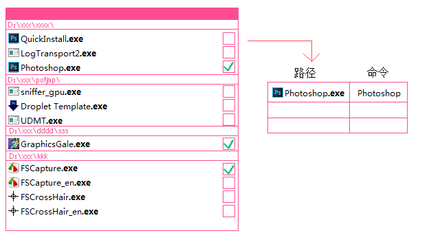 每一个记录的项目,应该保存三个属性:路径,命令,程序特征。