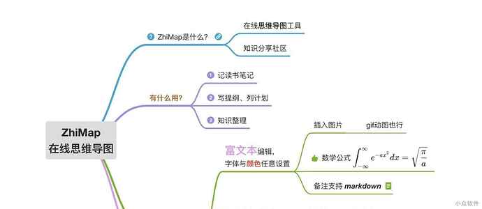 除了一般思维导图都有的功能外,还支持富文本、数学公式、插入图片、Markdown备注、以及多人协作。