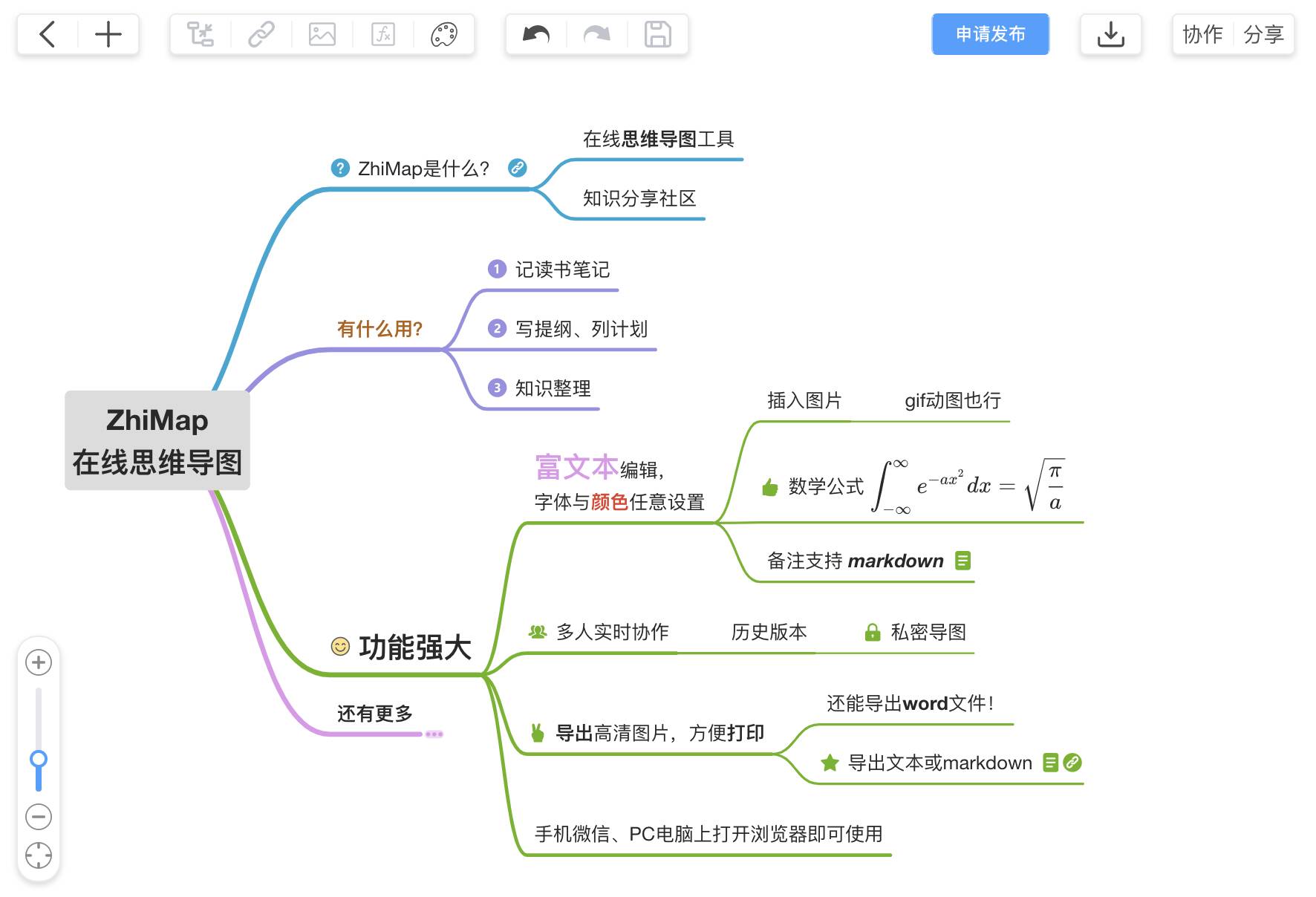 之前只知道百度有个脑图,今天发现一个功能更强大的网页版思维导图:ZhiMap,同样也是网页版+免费。