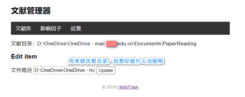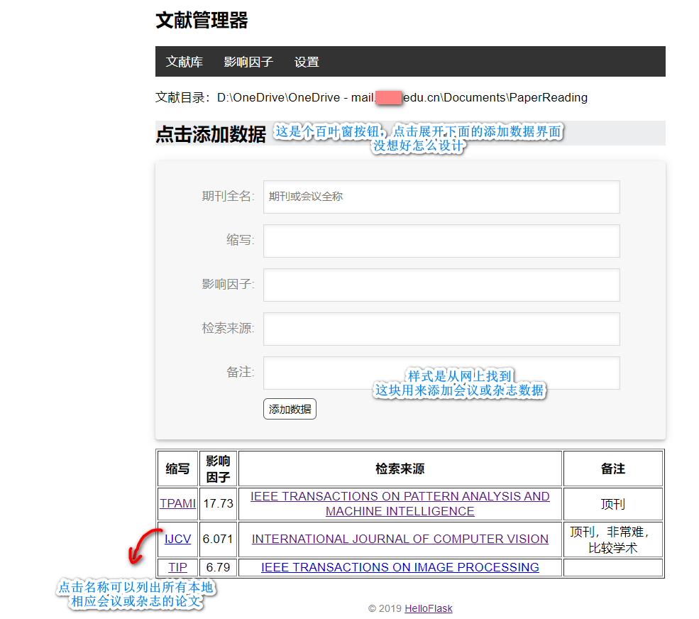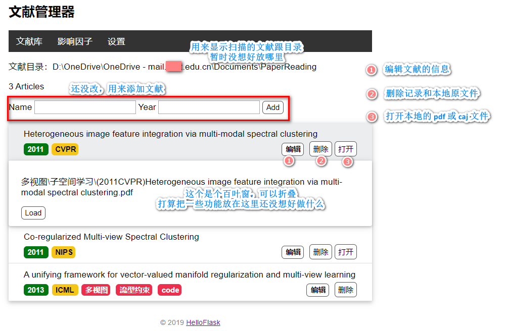 docs_path管理系统扫描的参考文献根目录;category层级表示最顶层分类,例如:多视图学习、子空间学习、硕博论文、其它;topic层级表示上层分类的一个子话题,例如:多视图学习分类包括多视图缺失、多视图深度、多视图张量、子空间学习等子话题或方向;tag层级表示本话题论文的按特点进行分类,例如:子空间学习方法下可以包含流型约束、一致性约束等论文特点标签;doc_name即文件名,其中ext为文件格式,支持pdf、caj,其它不符合要求的文件将会被过滤。
