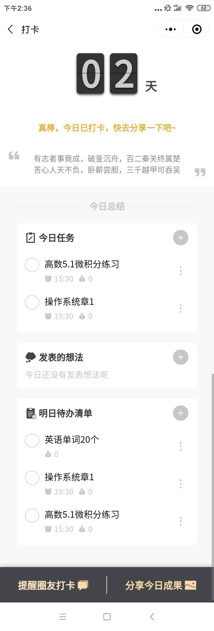打卡的方式也很特别,在这里你可以看到自己今日完成的任务,明日的计划,以及今日的反思与回顾。可以方便的进行 每日复盘 。
