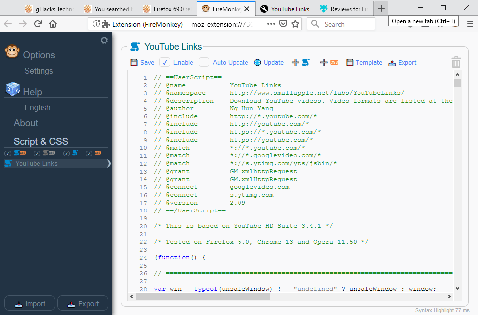 火猴(FireMonkey)是一款专门为 Firefox 开发的浏览器扩展,能对用户脚本及样式提供一体化管理,支持从 Greasyfork 或者本地磁盘(file:///)导入脚本,使用 Firefox 原生 API 来载入脚本,而整个扩展仅有 69.49 KB 大小。