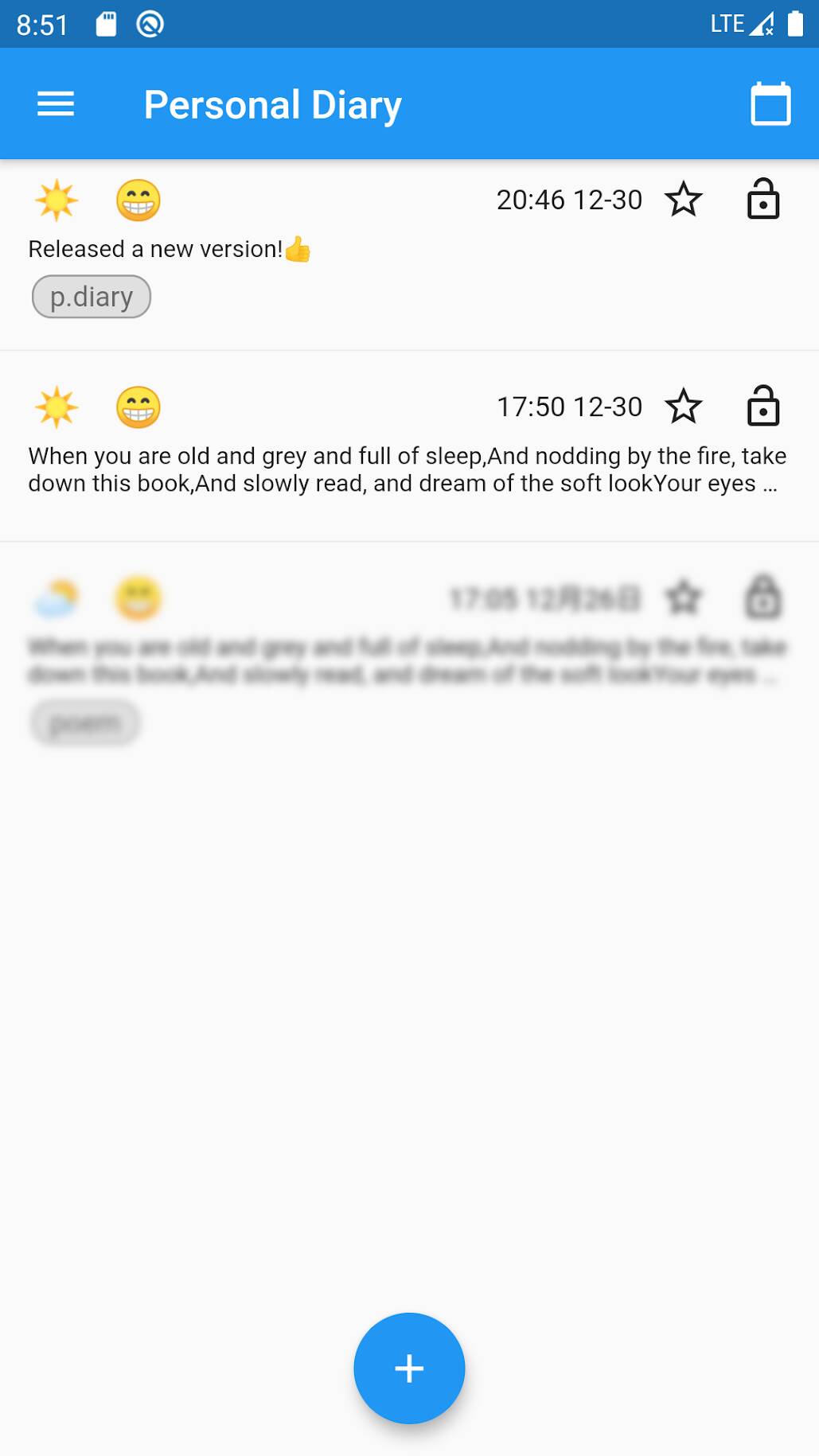 - 可以针对单篇的日记进行加密存储,加密后的日记在列表中会模糊显示