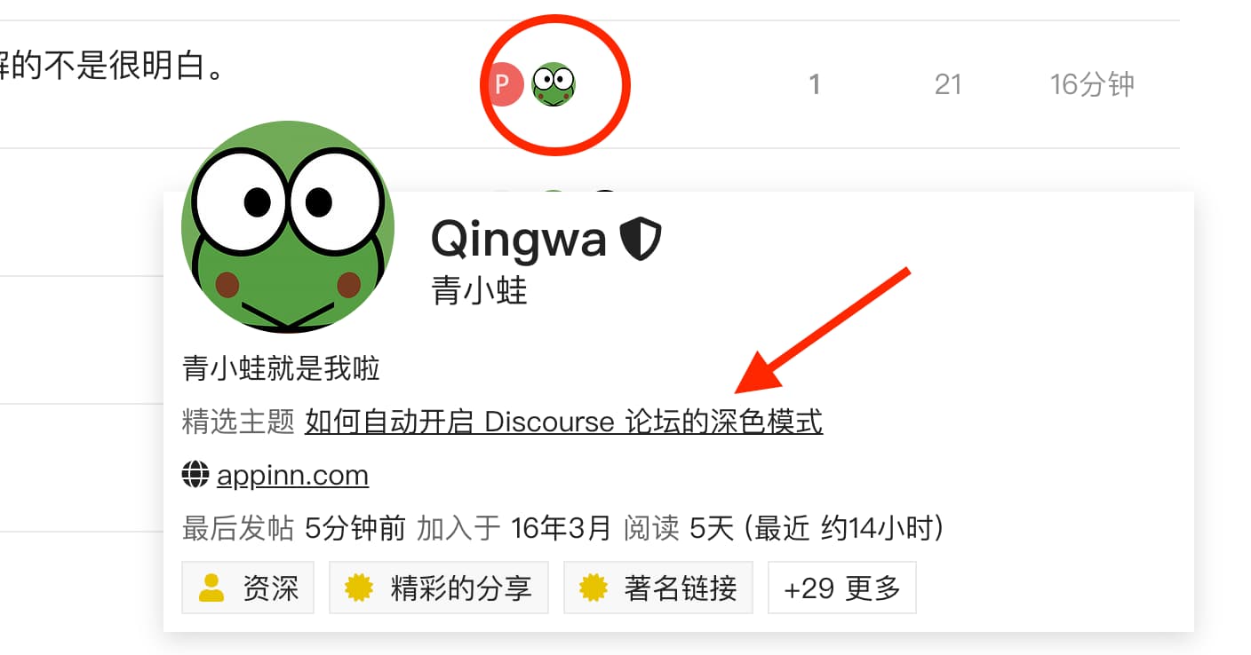 一个新的小功能,可以在你的个人页面上附带一个你觉得可以代表你自己的精选主题了,大概就是这个样子: