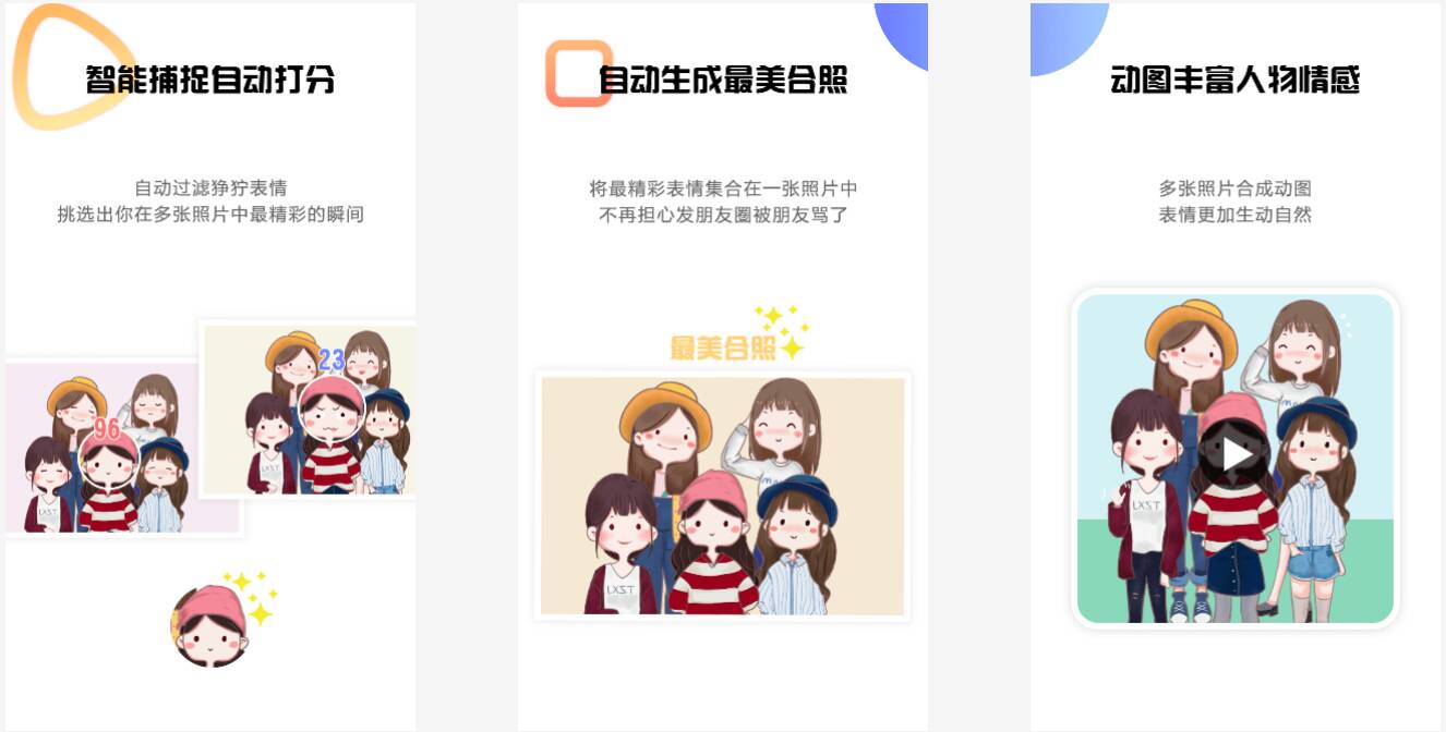 通过表情识别算法,从连拍照片中选择每个人最精彩的表情,合成为最美合照。