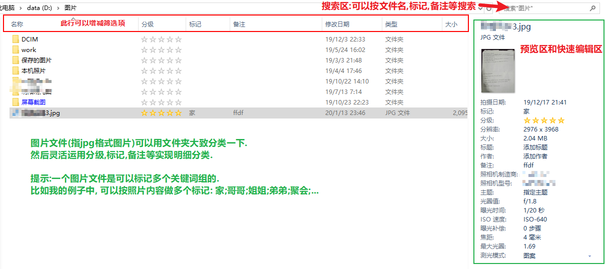 一般人在windows系统下都有这些文件,图片,视频,压缩包.文档.当数据多的时候,就需要归类整理,之前我消耗了很多时间去找一些第三方的辅助软件,比如管理图片要ps那个bridge,管理视频的更多了,比如极影派.在固定的电脑上这些都不错的.但如果移动了,并不是每一台电脑都有这些软件.用第三方软件所修改的内容,并不能显示在另一台没有第三方软件的电脑上.考虑到跨机移植性,最后我还是回归到windows自带的这些软件功能上.因为windows的资源管理器修改的文件元数据都是保存到文件本身,而不是本机系统.