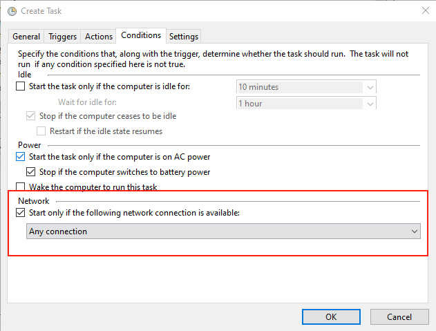 可以看看任务计划程序(Task Schedule),新建任务中,条件(Conditions)有一个 “Start only if the following network connection is available”,我这边是英文系统,具体不知道中文翻译是什么,但大概位置可以参考一下