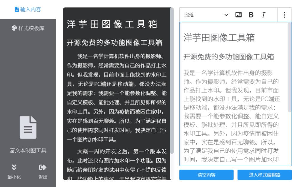利用内置的富文本编辑器创作文章或从其他编辑器(如Microsoft Word等)粘贴文章,之后自定义样式并输出成图片,对于需要在社交媒体(朋友圈、微博等)发布富文本内容的用户较为实用。