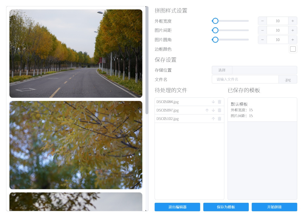 将多张图片拼合为一张长图,可以自定义内外边框的宽度、颜色和图片圆角。最大支持输出高度为16000像素的图片(更长的图片将会被压缩),基本能满足绝大多数人都需求,保证拼接后每张图片的清晰。
