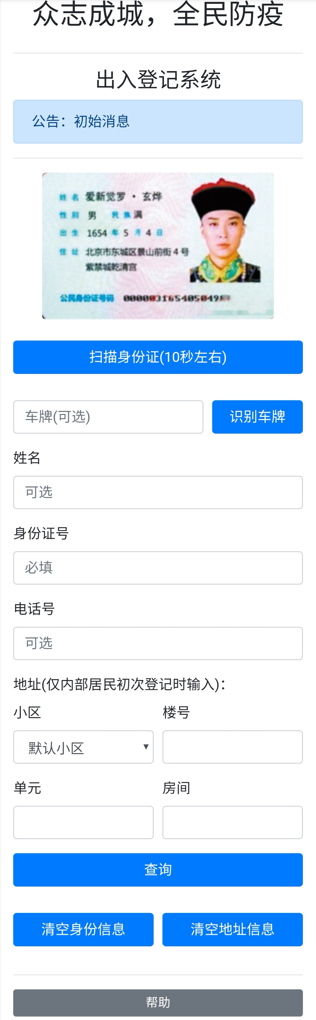 疫情当前,人人有责,本应用可以帮助小区、单位、楼宇的门卫,防疫卡点等实现人员出行统计,限制居民出行次数和外来人员访问,无需“通行卡”,“通行证”等,扫描识别身份证信息,减少接触,防止交叉感染,欢迎需要的朋友使用,或向您身边可能需要的人推荐