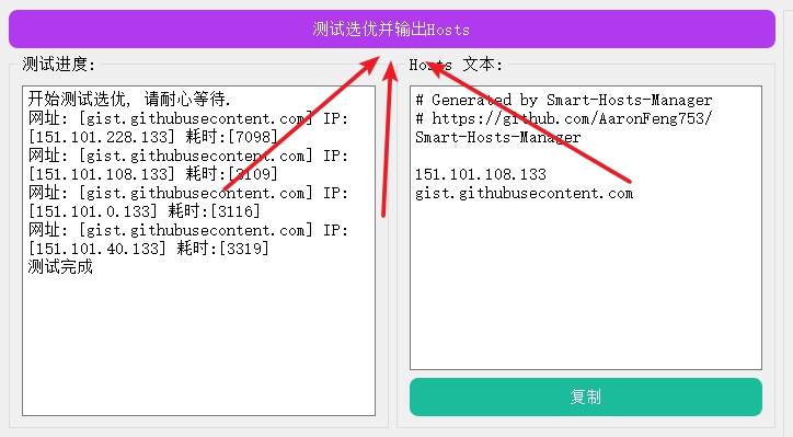 最后生成一段包括了每个网址和其对应的最佳IP的Hosts文本.用户只需要将该文本复制到hosts文件内并保存应用即可.