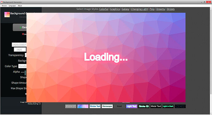 它的图形模板提供了超过120种小图标,可以生成小图标组成的背景。还有几个多边形、梦幻、线条的类型,挺酷炫。还可以通过左边菜单栏里添加文字,提供了几个文字特效。除了生成jpg格式图片,如果想生成透明背景的图片,可以修改背景类型然后保存成png格式。