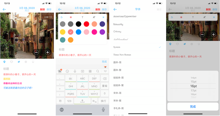 旅行日记提供了丰富的富文本样式。你可以选择多样的文本颜色(后续会增加越来越多的颜色选择)、字体样式(字体、字号)、斜体、下划线、中划线。居左、居中、居右,当然了,你也可以添加视频!