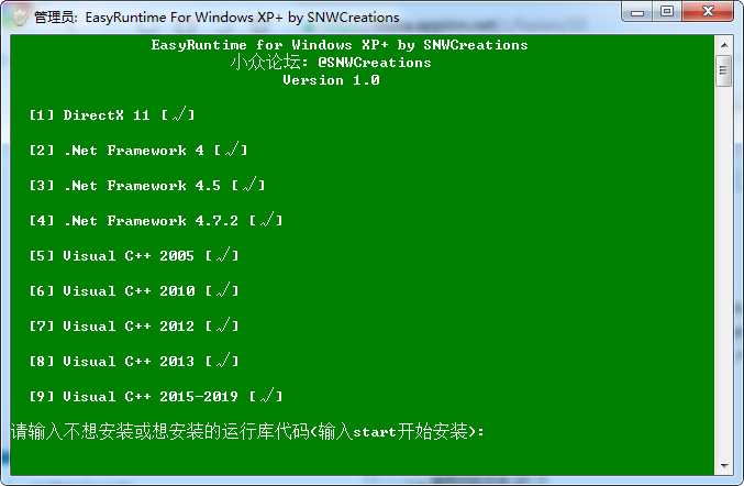 如果不想安装一个运行库在菜单上输入对应的代码就可以了,如果你突然又想安装了,也没关系,输入那个号码就可以了,如果你发现有一些本来就是"×"的,证明安装程序不存在,就算你输入了那个号码也无法更改。