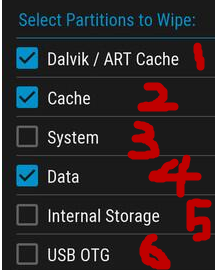 如上图所示是twrp里wipe时的勾选选项,其中1和2就不说了因为我看双清到四清1和2是铁定要清的。6是otg方式连接的优盘啥的(不知为啥在我的手机上twrp里这项叫usb-ctg而不是otg)。我的问题是: