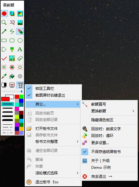 提供截图板书、黑板、白板、透明板等9块教学板,每板支持无限页面;可随时切换到任一页面复习回放;支持各类视频或PPT播放中板书标注及回放;支持文字朗读。既可作上课板书辅助,又可独立制作课件,反复复用