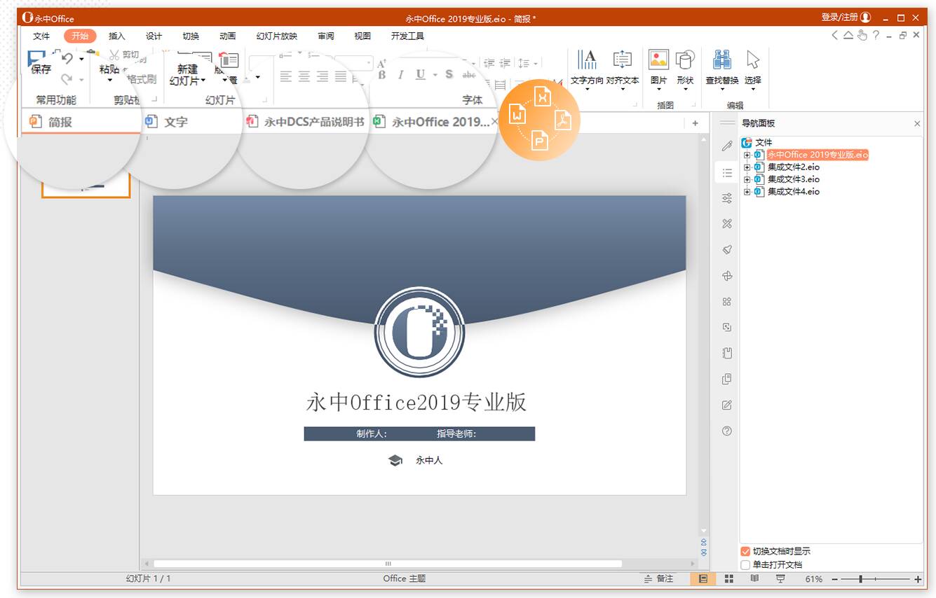 永中Office特有的集成应用,可以实现把Word、Excel和PPT文件在一个软件中打开,相对于旧版,永中Office 2019专业版新增多种功能,并优化了使用界面,更贴合用户的使用习惯,满足更多办公需求,帮助用户获得更好的Office办公体验。