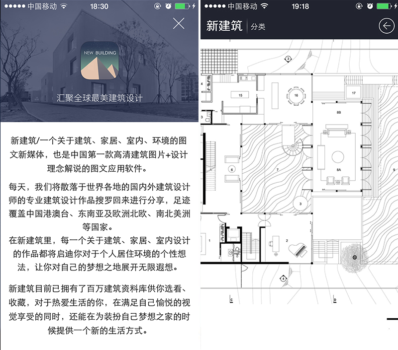 在双手捏合缩小图片的状态下可以看到建筑整体布局,在双击查看大图时「新建筑」首创的轻转手机浏览的模式在增加阅读新鲜感的同时页便于用户了解局部结构等。不得不说,这样流畅的手势操控,每处用心的设计都充满了优雅的气质。