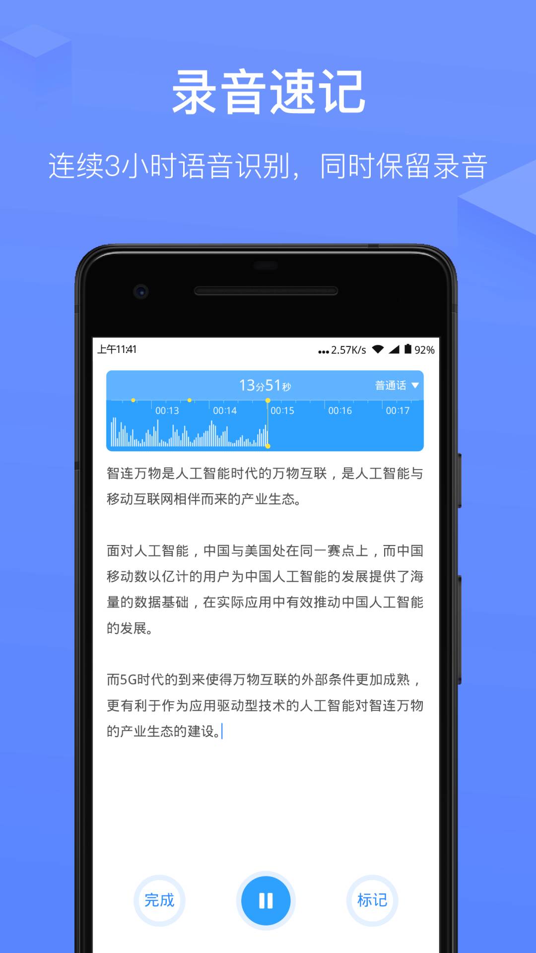 讯飞语记由科大讯飞出品,是一款专注语音输入的综合类云笔记,支持实时语音听写、高精会议转写,OCR拍照识别、图文编排、智能任务提醒等功能。是您写小说、采访、会议记录的必备神器!