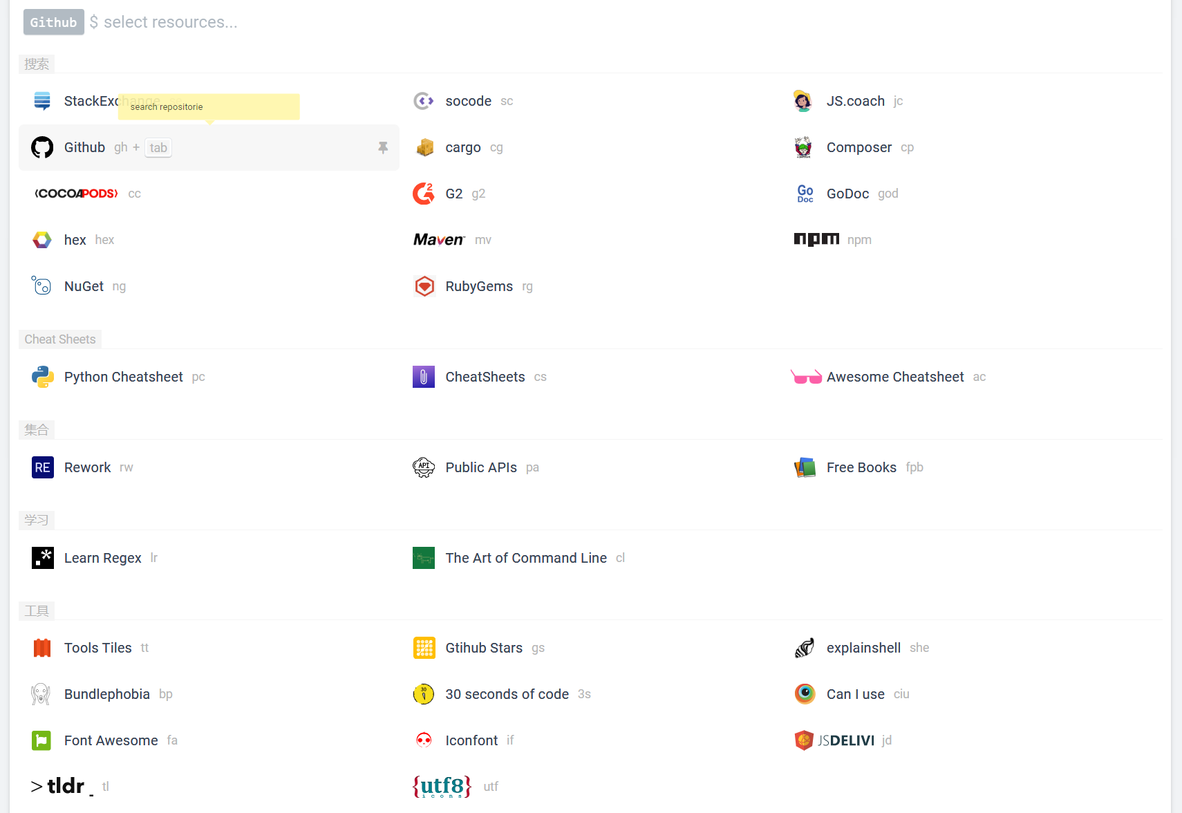 在快捷舒适的输入框中搜索 编程文档、Cheat Sheets、工具、pacakges 等各类资源。
