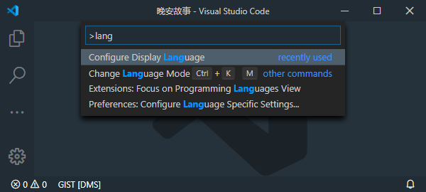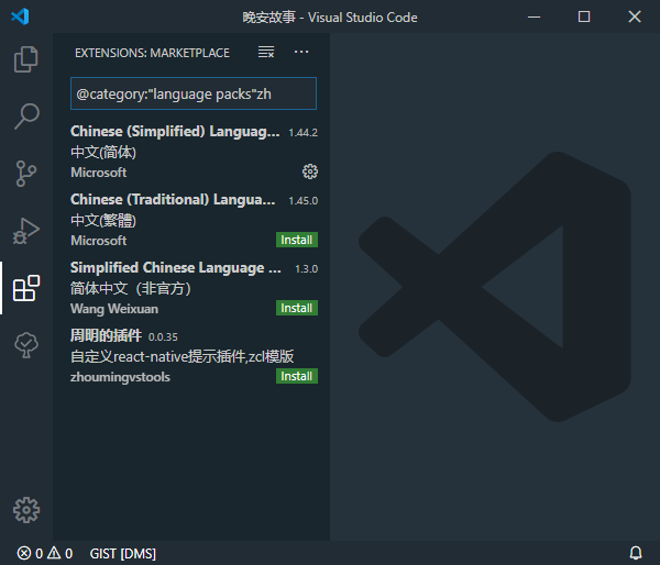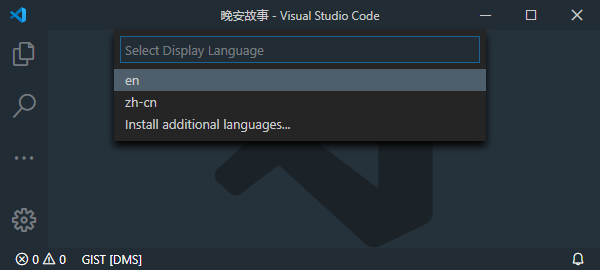F1 或者 Ctrl+Shift+P ,这时候注意观察,在编辑器的上面,中间的位置,会显示出一条输入框,用来输入命令,操作编辑器;lang ,应该就可以看到这样一个选项 Configure Display Language ,那么选中他,回车en 表示英文, zh-cn 表示中文简体,选择我们需要的那种语言就可以了;Install additional languages ,选择它,就可以进入扩展管理安装更多的语言包;Chinese (Simplified) Language Pack for Visual Studio Code ,点击它后面那个绿色的按钮( Install ),就可以安装这个语言包.你说什么?这操作太复杂了。是啊,确实有一点。这是因为日常我们不会用这样的方式去操作软件,所以第 1 次接触觉得不太习惯。等你发现这个编辑器的一切操作,都可以通过这个小小的命令输入框去实现,你会逐渐感觉到他的美好和简单。当我们想做一个操作,却不知道应该到哪里去进行的时候,那么在命令框里搜索一下,基本都可以立刻将问题解决掉。
