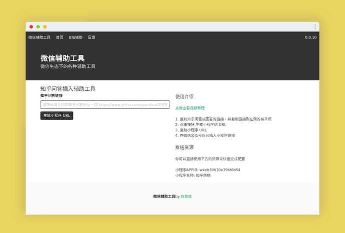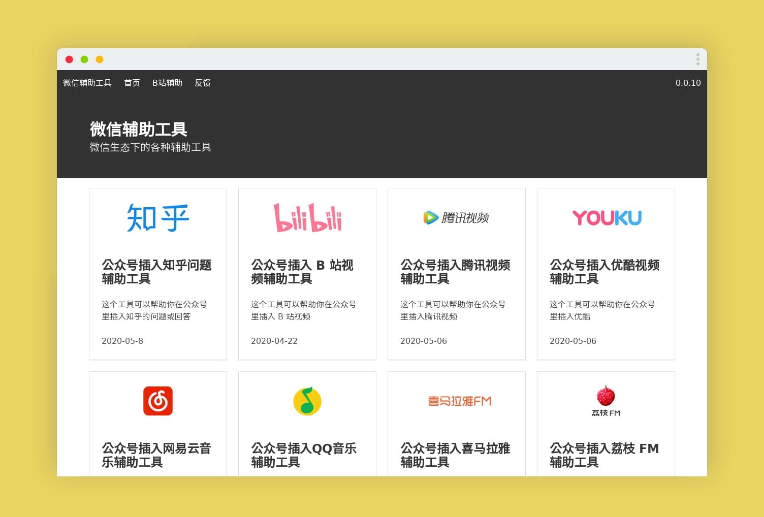 微信辅助工具是一个帮助你在微信公众号文章中插入不同社区、平台的小工具。借助微信辅助工具,你可以轻松的在微信公众号文章中插入诸如 Bilibili视频、知乎问题、知乎回答、腾讯视频、优酷视频、网易云音乐、QQ音乐、喜马拉雅 FM、荔枝 FM、豆瓣电影、豆瓣图书、豆瓣音乐、百度网盘、腾讯问卷、什么值得买等平台。