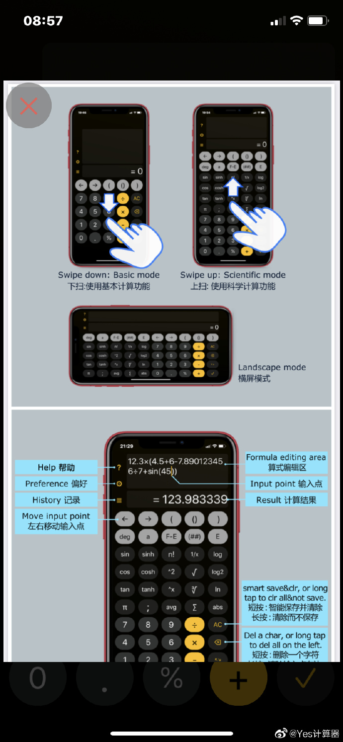 Yes 计算器 是 iPhone 和 iPad 上的一款 计算器 App: 进行算式编辑-保存-重用,对于复杂算式尤其有用,基本型大键盘和科学型键盘上下扫快速切换,非常好用!