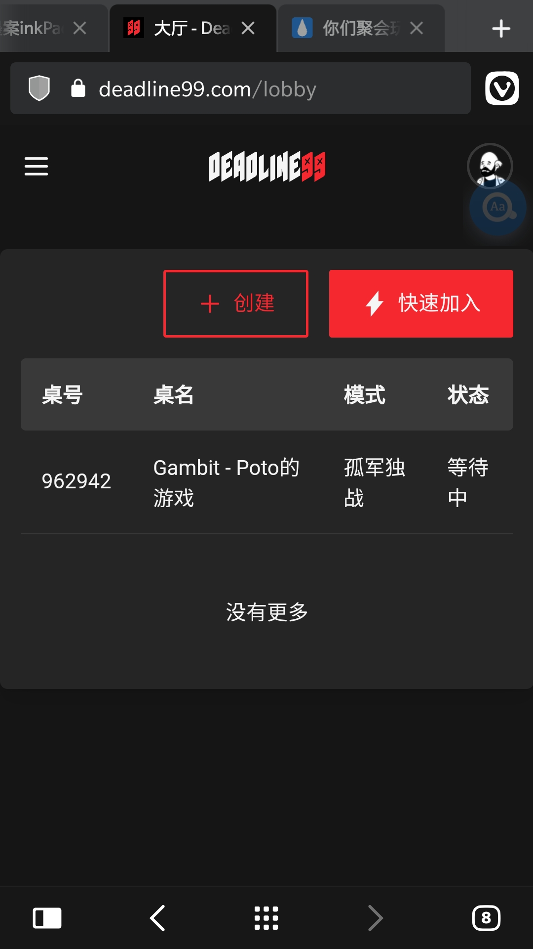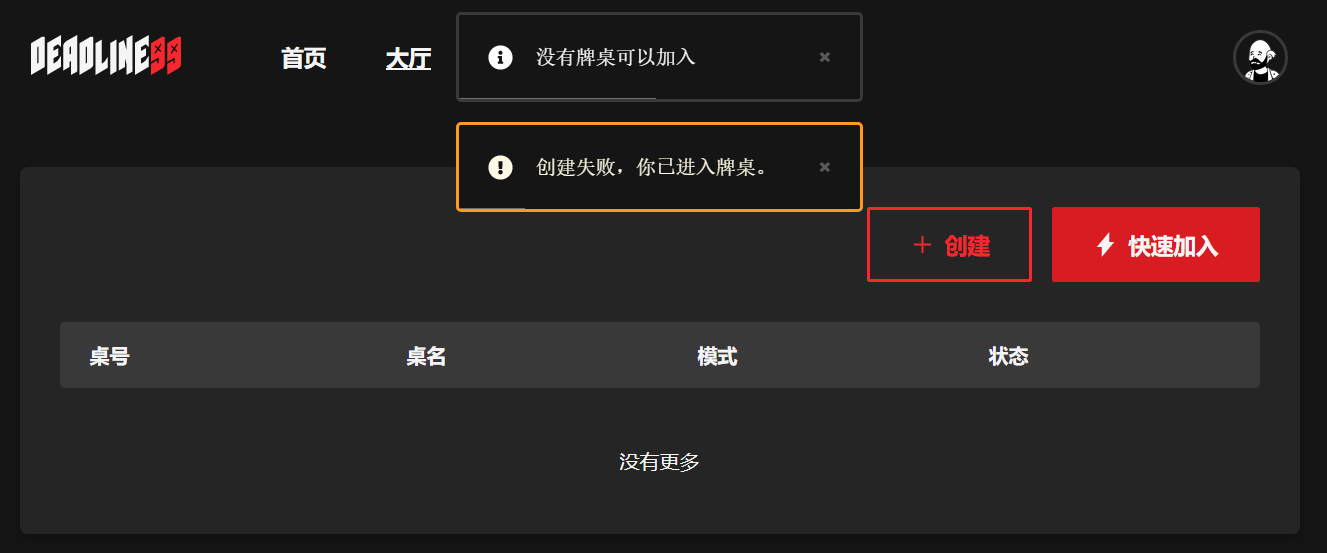 “已进入牌桌” 应该是连接中断了,试下刷新页面,主要是因为服务器在外,可能连接不太稳定。
