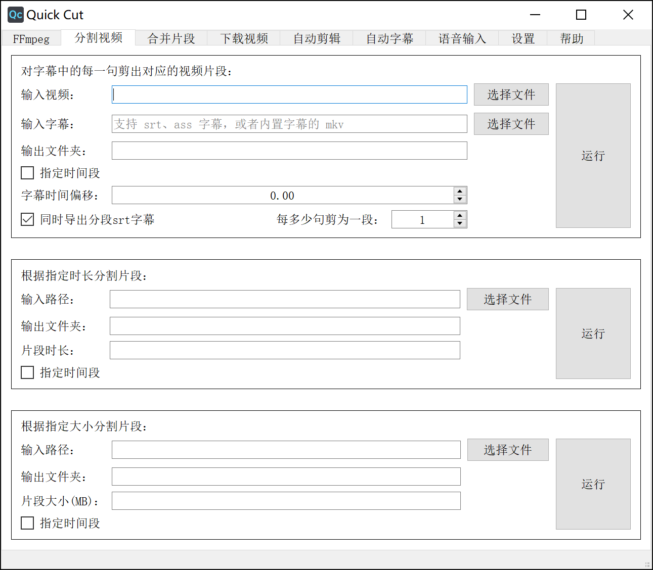 这个界面有三个功能:根据字幕分割视频、根据大小分割视频、根据时长分割视频。