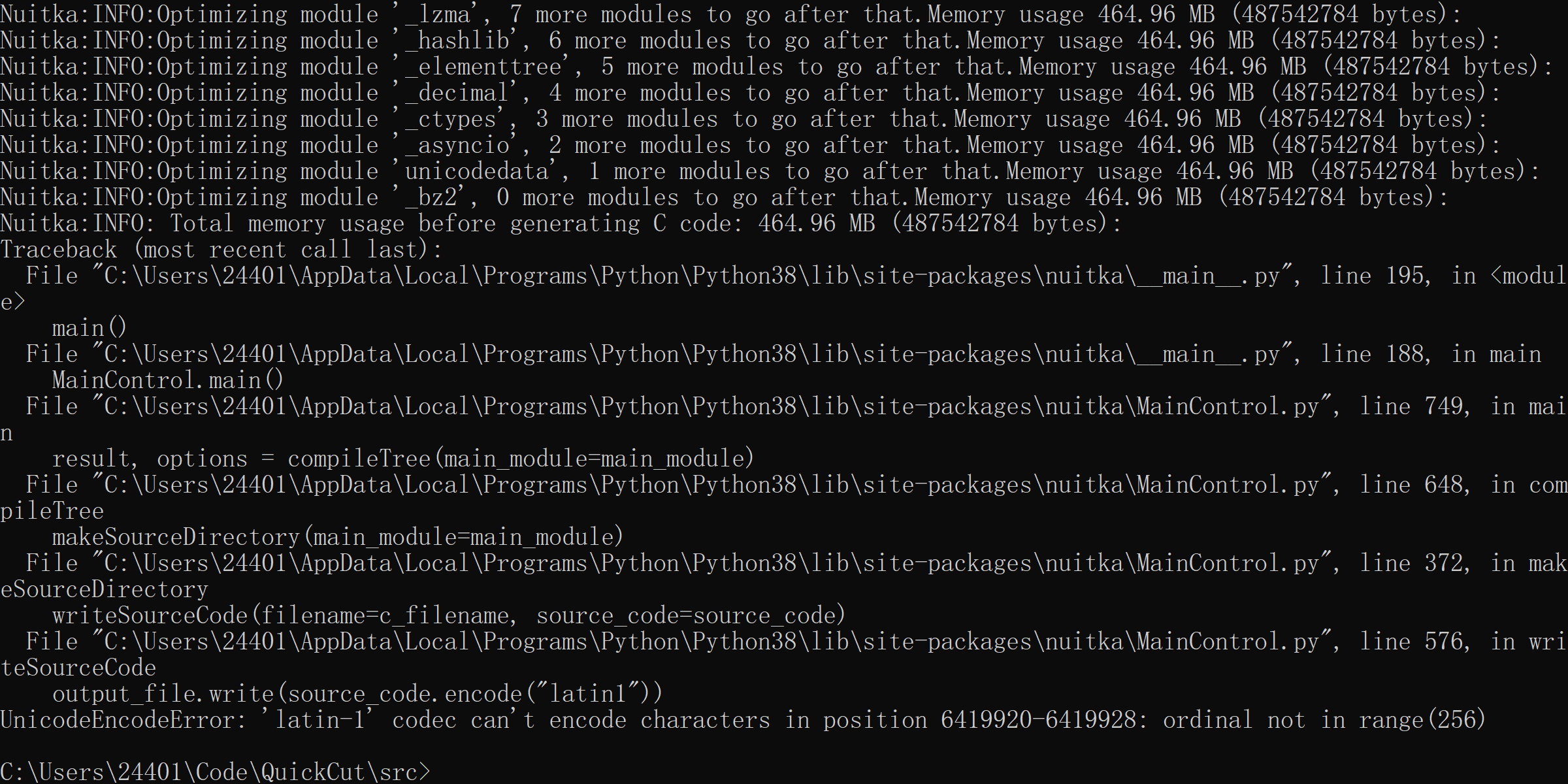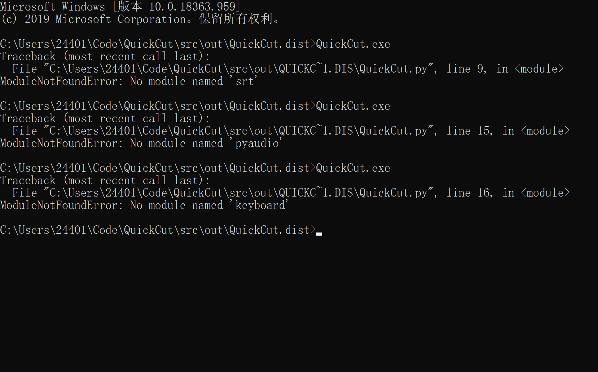 然后再编译的导出目录在命令行窗口中将 QuickCut.exe 打开,会看到类似这样的错误: