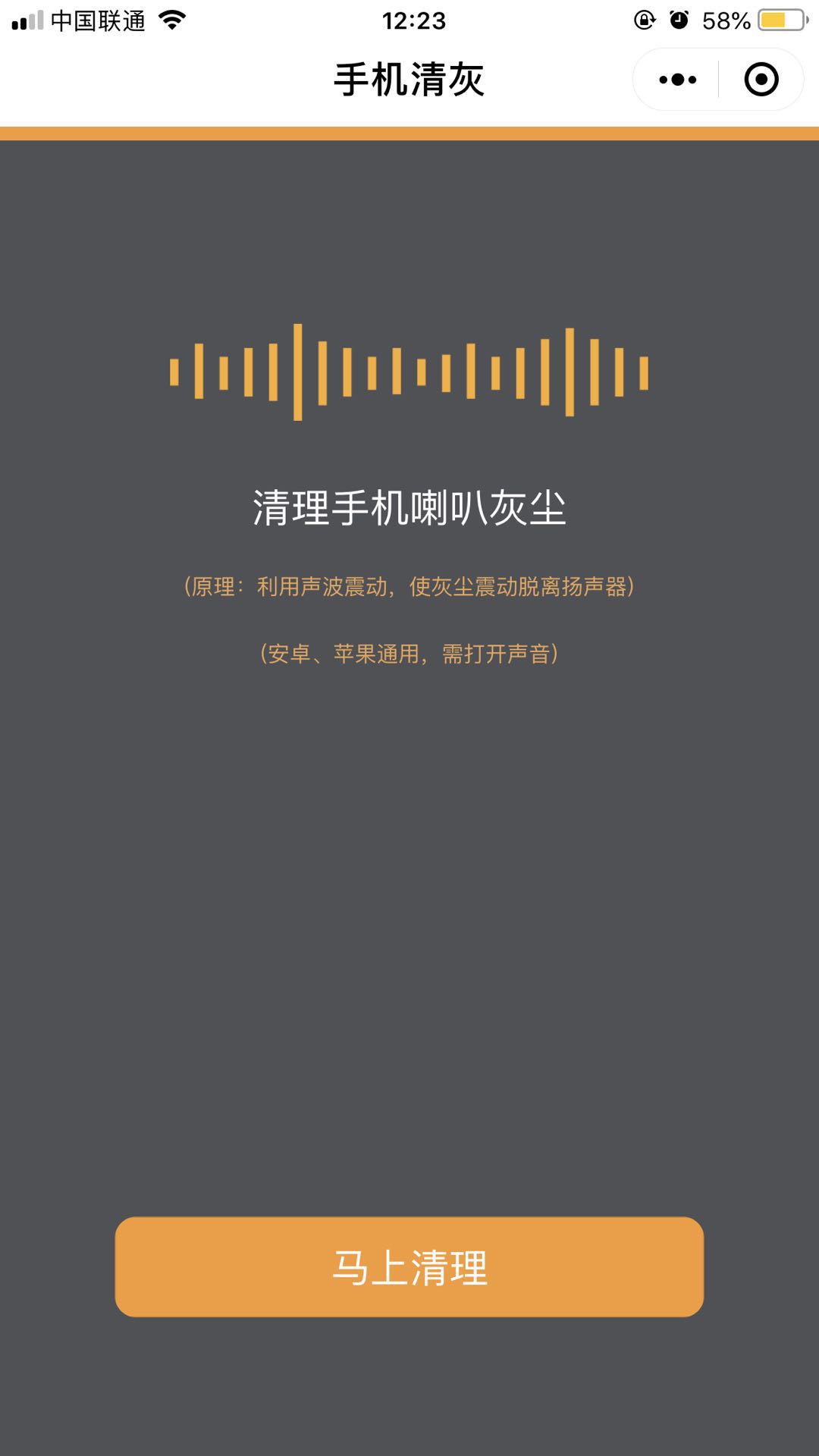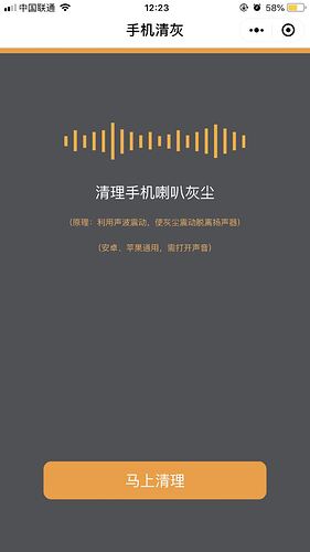原理:声波除尘,手机的扬声器会吸附很多灰尘,从而导致扬声器声音变小,利用声波震动,使灰尘震动脱离扬声器,进而达到除尘效果。