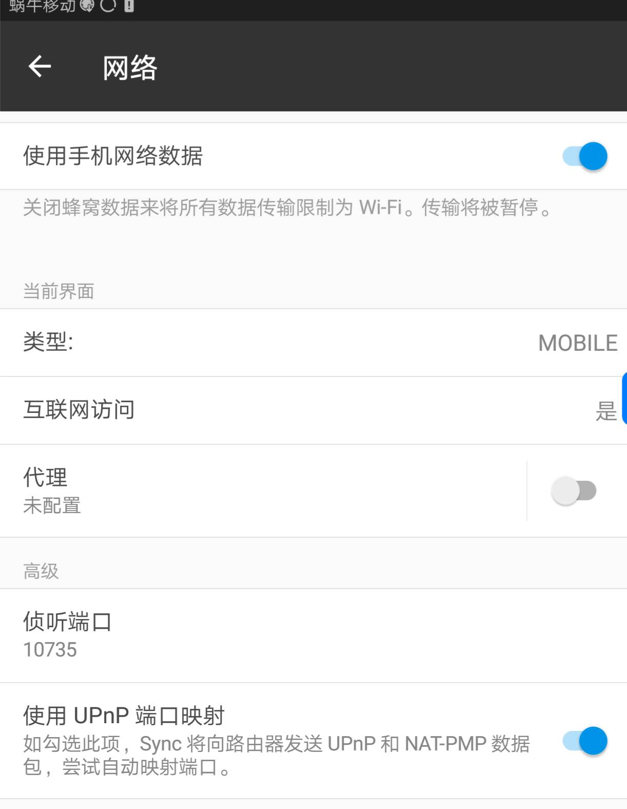 设置>网络,勾选允许使用移动数据同步,并记录Sync在这台手机上所使用的端口 -