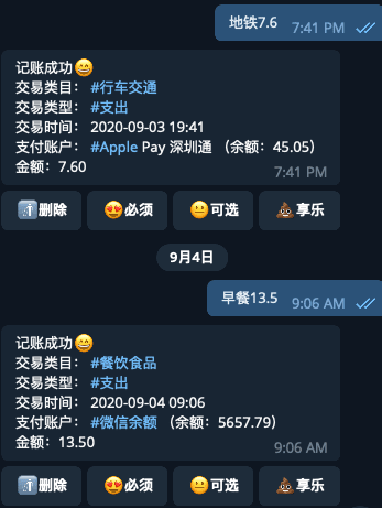 通过配置规则,可以实现快速记账,通过绑定 Telegram Bot 可以实现发送消息记账,效果入下: