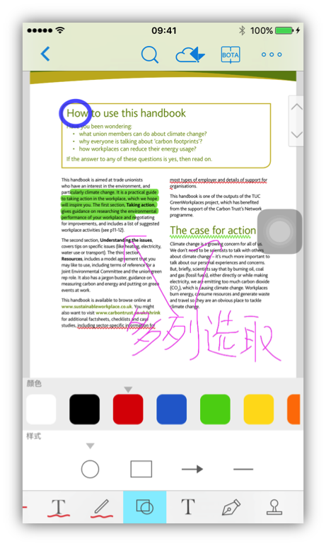 批注工具应有尽有,可以直接在 PDF 文件上使用荧光笔工具标高亮、划线,并且长按工具图标,还可以切换颜色、透明度、粗细等,但本宝宝比较任性,更喜欢使用手写(freehand)和图形(shape)功能,爱画哪儿画哪儿,爱怎么圈怎么圈~请忽略小编的字太丑,我会用手写功能多练字的。