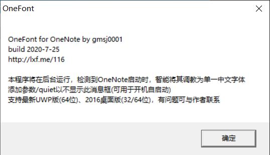 使用方法:启动OneFont.exe使之在后台运行,程序会检测到OneNote的启动,并将其调教为不会自动切换字体。OneNote设置中需设置为包含英文的中文字体(例如宋体、微软雅黑),不要设置为纯英文字体。