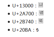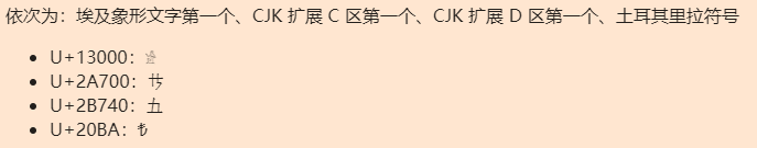 依次为:埃及象形文字第一个、CJK 扩展 C 区第一个、CJK 扩展 D 区第一个、土耳其里拉符号