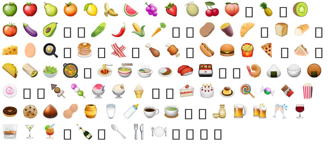 我这里除了 New Emojis 和 Windows 上几乎都没有(“喜闻乐见”)的 Flags 外都是全的。或许可以试试谷歌的 Noto Emoji fonts。