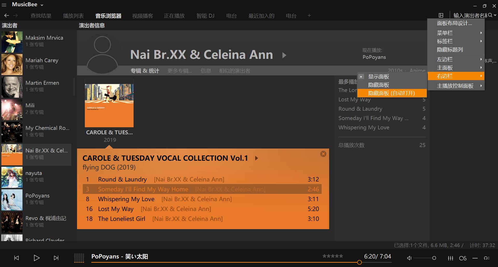 每个面板的标题文字都可以点击并在菜单中快速切换显示的内容。在侧面板,不止可以使用音乐文件的tag作为检索依据,还能使用文件夹、自定义tag、虚拟tag进行检索。而在主面板,也有专辑、曲目列表、带专辑分组的曲目列表等不同展示模式。