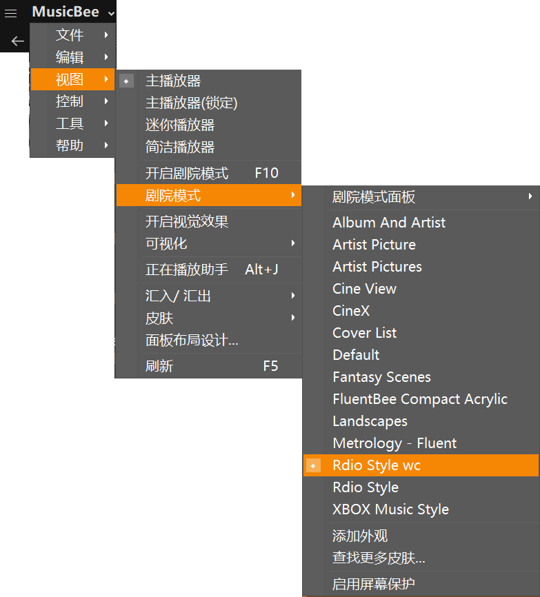 MusicBee和其他软件的皮肤很不相同。软件菜单中的皮肤,本质上其实是配色方案。而真正影响外观的,是面板布局设置和剧院模式。