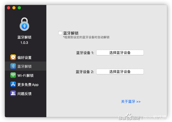 当我们使用蓝牙解锁时,首先我们要在系统设置中关闭屏幕锁定,然后进行Mac电脑与手机蓝牙配对,然后勾选蓝牙解锁。两个蓝牙设备,只要检测到其中一个蓝牙信号就可解锁