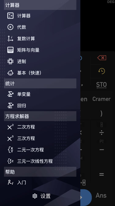 非常齐全的实数计算、复数计算、矩阵、进制转换、单位转换、画图、统计、解方程功能(除了第一个计算器,剩下的我都用不到==)